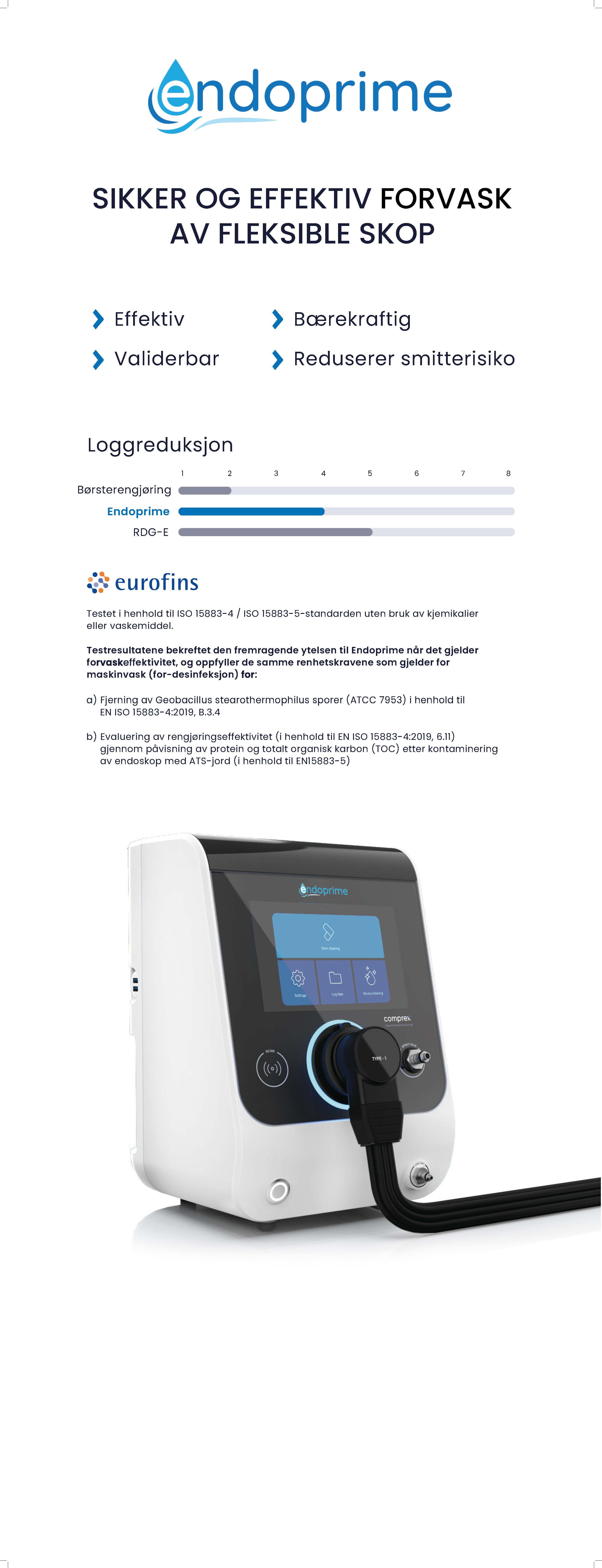 - Endoprime er en automatisk rengjøringsinnretning som benytter det patenterte impulsskyllingssystemet comprex®, som i én syklus på ca. 5 minutter erstatter manuell børstevasking med vann- og luftpulser for rensing av alle kanaler i et endoskop.